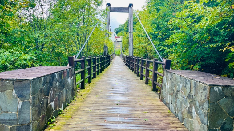 さらに進むと、遊歩道の先には風情のある小さな橋がかかっていて、ここを渡って日帰り棟「薬師の湯」へ向かいます。薬師の湯のすぐ前にも駐車場はありますが、この橋を渡る散歩道がとても素敵で、あえて本館に車を停めて歩いて行きました。
