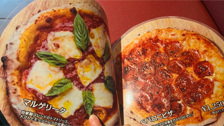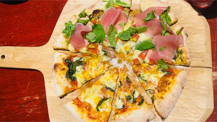 ピザメニューがピザの形をしていてとても可愛く、思わず注文。見た目も華やかで、香ばしく焼かれた生地はモチモチ。シンプルなのに深みのある味で、おしゃれな一品でした。