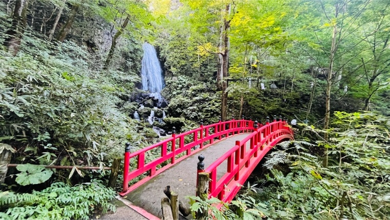 - 日本の滝百選「不動の滝」|赤い橋と滝の美しいコントラスト