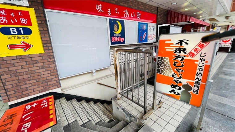 不来方じゃじゃ麺は盛岡市大通の地下街にあります。階段を降りると少し薄暗い地下通路が広がり、正直なところ「ここに本当にお店があるの?」と不安になるような雰囲気。地下街の中はシャッターが閉まったお店も多いですが、不来方じゃじゃ麺は営業中の看板がちゃんと出ています。知っていないと辿り着けない感じが、逆に印象に残ります。