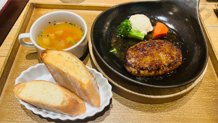 見た目はシンプルですが、素材の味がしっかり感じられるハンバーグ。お肉本来の旨みが引き立っていました。ごはん&味噌汁セットとパン&スープセットが選べて、今回はパンをチョイス。ハード系のパンは普段あまり食べない私でも、フランスパンがおいしくて感動しました。