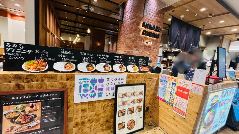 盛岡駅ビル「フェザン」1階のみのるダイニングは、アクセス便利で子連れにもやさしいお店。広めの店内で過ごしやすく、地元民にも観光客にも人気です。
