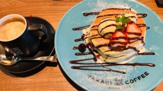 高木珈琲 盛岡mossビル店は、大阪発のパンケーキカフェ。ふわふわパンケーキが人気ですが、ハンバーグやパスタなどのカフェごはんもおいしくておすすめです。キッズメニューはありませんが、どのメニューも子どもとシェアしやすく、娘とパンケーキを分け合いながら楽しくランチタイム。