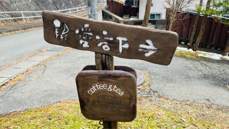 カフェへ向かう道は想像以上に急な坂道で、道幅も狭い。本当にこの先にカフェがあるのだろうかと、少し不安になりながら進んでいると、「愛宕下→」という木の看板が目に入り、ほっとしました。この道のりも含めて、すでにちょっとした非日常の始まりだったように思います。