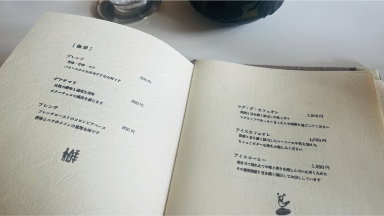 メニューを開くと、選べるのはコーヒーや紅茶、りんごジュースなどのドリンクのみ。ドリンクを注文すると、その日のおやつが一緒についてくるスタイルのようでした。おやつは選べませんが、「どんなおやつがついてくるんだろう」とわくわくした気持ちになりました。