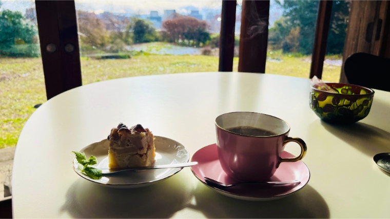 カフェスペースには暖炉があり、大きな窓の向こうには庭が広がっています。12月初めの訪問だったため紅葉は終わっていましたが、暖炉のあたたかさとパチパチする音・庭の景色の組み合わせが心地よく、静かな時間を過ごすことができました。ただ座って景色を眺めているだけで満たされる空間でした。