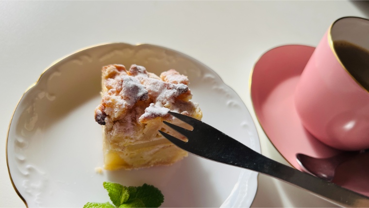 この日のおやつは、りんごがごろごろ入ったりんごケーキでした。粉砂糖がふんわりとかかり、雪が積もったような見た目です。季節を感じる見ためと、やさしい甘さに癒され、とてもおいしくいただきました。