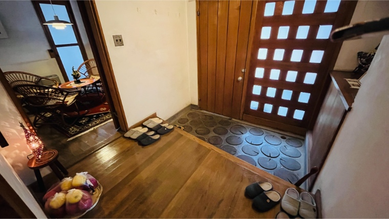 玄関のブザーを鳴らすと、店主さんの「はーい」という声。扉を開けると、まず玄関で靴を脱ぎ、スリッパに履き替えます。入り口から「まさに古民家」で、まるで誰かのおうちに招かれたような気持ちになりました。